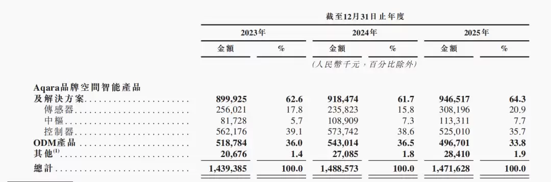 目前,绿米联创的主要业务包括Aqara品牌空间智能产品及解决方案和ODM产品。其中Aqara品牌空间智能产品及解决方案的收入从8.99亿元增至9.47亿元,占总收入的比例从62.6%升至64.3%。