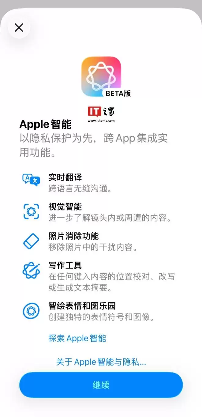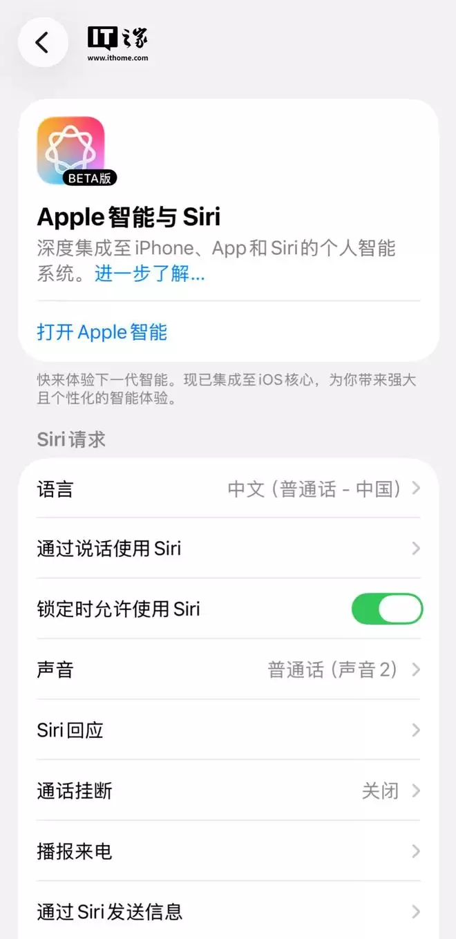 IT之家 3 月 31 日消息,今日凌晨,苹果送上一份惊喜,苹果 Apple Intelligence 国行 Beta 版开始分批上线(需升级至 iOS 26.4 及以上系统)。