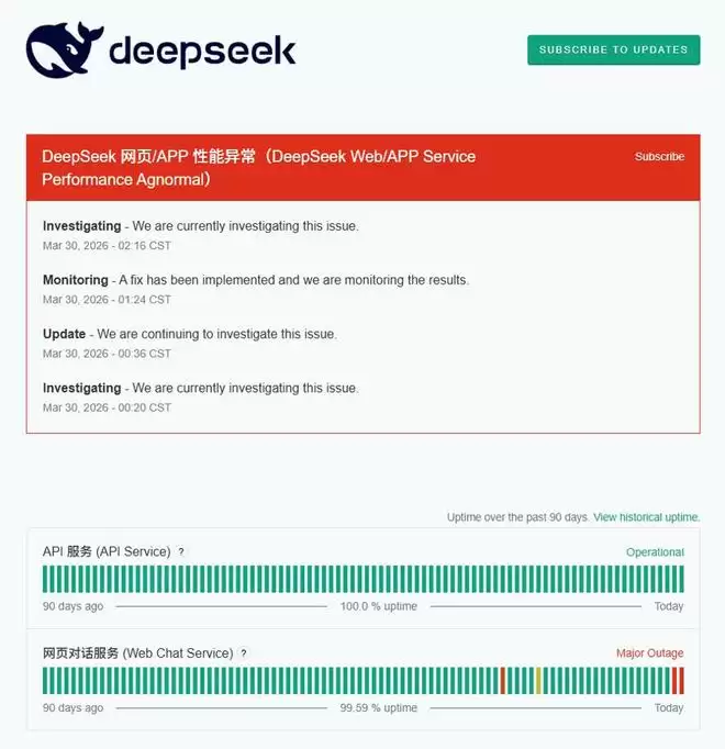 3月29日深夜,DeepSeek突发大规模服务中断,网页端与App同时瘫痪,频繁显示“服务器繁忙”,故障持续超过11个小时,创下成立以来单次故障最长纪录,“DeepSeek崩了”话题冲上微博热搜。