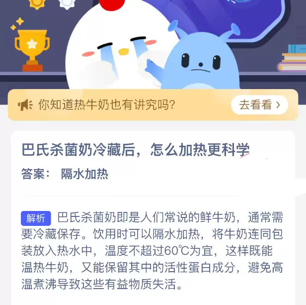 巴氏杀菌奶冷藏后,怎么加热更科学?支付宝小鸡课堂开课啦!每天只需花一分钟,动动手指答对问题,180g饲料立马到账!不仅自家小鸡吃得饱饱的,还能顺便捐个爱心,一举两得!2026年3月30日蚂蚁庄园的小鸡课堂题目正确答案是【隔水加热】,巴氏杀菌奶冷藏后,最科学的方式是隔水隔水温热加热。将牛奶倒入容器放进温热热水中缓慢升温,避免明火直煮、微波炉高温快热,既能保留牛奶营养与原生口感,又不会因高温破坏蛋白质和活性物质,温和适口还更健康安全。