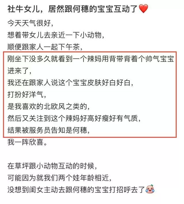 网友的宝宝因为跟何穗的宝宝年龄相近,主动过去跟他打招呼,保姆带着何穗宝宝热情回应。网友还透露了宝宝的长相,表示模样像妈妈,但懵懵的表情像爸爸。