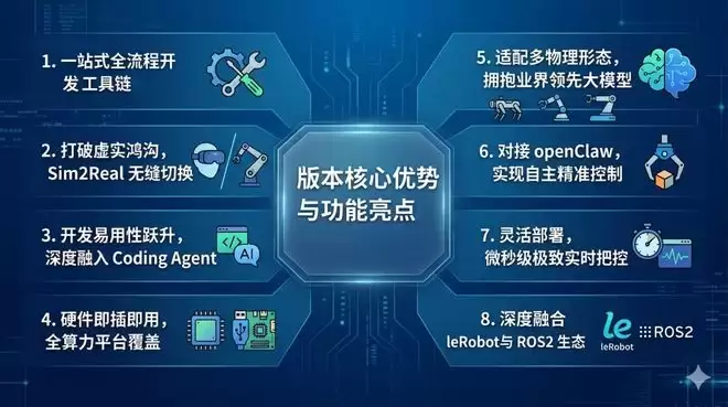 一站式全流程开发工具链 为大幅降低具身智能的开发门槛,新版本提供了一站式全流程工具链,全面覆盖环境搭建、仿真调试、数据录制、一键部署以及可视化运维,让开发者能够专注于算法创新与业务逻辑。 打破虚实鸿沟,Sim2Real 无缝切换 在具身智能特别是模仿学习的研发中,跨越仿真与真实物理世界的鸿沟、解决算法泛化难题一直是核心痛点。IB-Robot 架构原生支持 mujoco、gazebo 等主流仿真工具,确保开发者在仿真环境中训练与验证的策略代码,能够直接在仿真环境与真实机器人之间进行无缝切换运行,极大提升了研发效率。 开发易用性跃升,深度融入 Coding Agent 系统提供了编译、运行、代码提交及 review 等丰富 skill,并深度融入了 coding agent 能力,构建起完善的 harness engineering 体系。通过智能化的开发辅助,代码管理与策略迭代的体验得到了跨越式提升。 硬件即插即用,全算力平台覆盖 在南向硬件生态方面,新版本预装了主流的电机、相机、激光雷达、语音等传感器与执行器驱动。无论是高算力的中央控制器,还是资源受限的中低算力边缘平台,均能实现真正的“南向即插即用”与完美兼容。 适配多物理形态,拥抱业界领先大模型 系统全面适配机械单双臂、四足机器狗、AGV 小车等多种复杂机器人场景。同时,内建对 ACT、Pi0.5、gr00t 等业界领先的大模型支持,从容应对搬运、多机协作等极具挑战的真实任务场景。 对接 openClaw,实现自主精准控 新版本原生对接并支持 openClaw,进一步完善了机器人末端执行器的精准把控,大幅增强了机器人的自主控制逻辑与操作能力。 灵活部署,微秒级极致实时把控 针对工业控制与协作机器人对实时性的严苛要求,系统提供了多种形式的灵活部署方案。在实时控制场景下,可实现微秒级(μs)的极致响应时延,确保机器人动作的顺滑与精准。 深度融合 leRobot 与 ROS2 生态 系统并非孤岛,而是深度融合了 leRobot 及广泛的 ROS / ROS2 开源生态,支持底层互联通信。海量的开源机器人资产、节点与算法包能够快速迁移并融入 openEuler Embedded 的操作系统底座中,助力开发者快速搭建扩展能力。