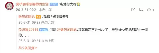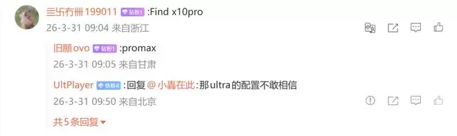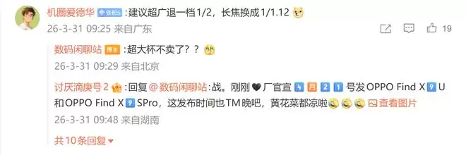 后续有用户在评论区表示:“建议超广退一档 1/2,长焦换成 1/1.12”,博主回复道:“超大杯不卖了??”;另一名用户则表示:“电池得大啊”,博主则回复道:“我猜会做到 8 开头”。