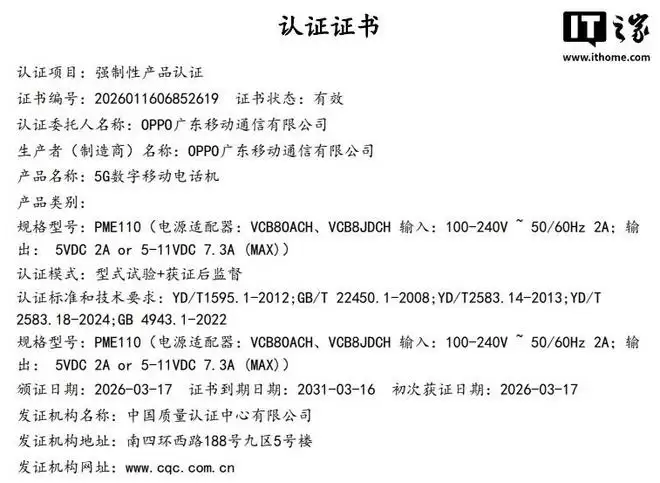 据IT之家此前报道,一款型号为 PME110 的 OPPO 神秘新机已经通过国家 3C 认证,@数码闲聊站 等爆料人士认为这是 OPPO Find X9s Pro 手机,标配 80W 充电器。