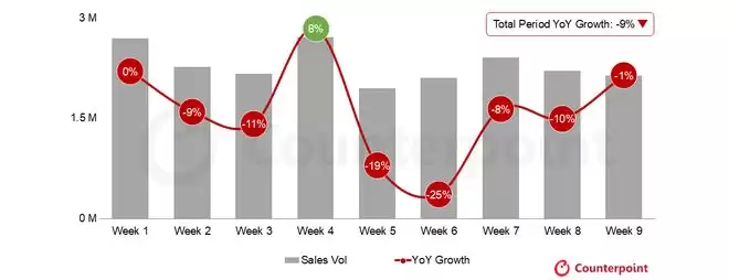 IT之家 3 月 31 日消息,市场调查机构 CounterPoint Research 昨日(3 月 30 日)发布博文,报道称 2026 年前 9 周印度智能手机市场遭遇倒春寒。