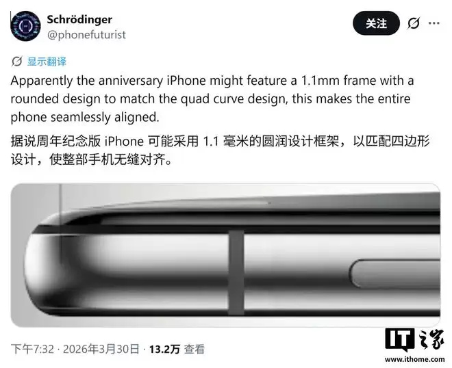 IT之家 3 月 31 日消息,消息源 @phonefuturist 昨日(3 月 30 日)在 X 平台发布推文,透露称苹果二十周年纪念款 iPhone 20 采用厚度仅为 1.1 毫米的极窄边框,并打造了独特的圆润边缘,让手机看起来像一块无缝玻璃面板。