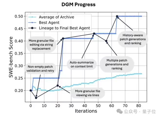 基于此,DGM能创造出各种自我改进方案,例如:增加补丁验证(Patch Validation)步骤、优化文件查看功能、增强编辑工具、生成并筛选多个解决方案以选出最优解,以及在进行新更改时,会自动添加历史尝试记录(并分析失败原因)以供参考。