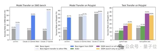 针对Claude 3.5 Sonnet优化的智能体,在切换到o3-mini或Claude 3.7 Sonnet时仍能提升性能。在Polyglot基准中,Python任务上的自我改进同样提升了Rust、C++、Go等不同语言任务的表现。