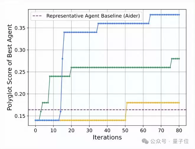 在Polyglot上,DGM的性能从初始的14.2%跃升至30.7%,远超由Aider开发的具有代表性的人工设计智能体。