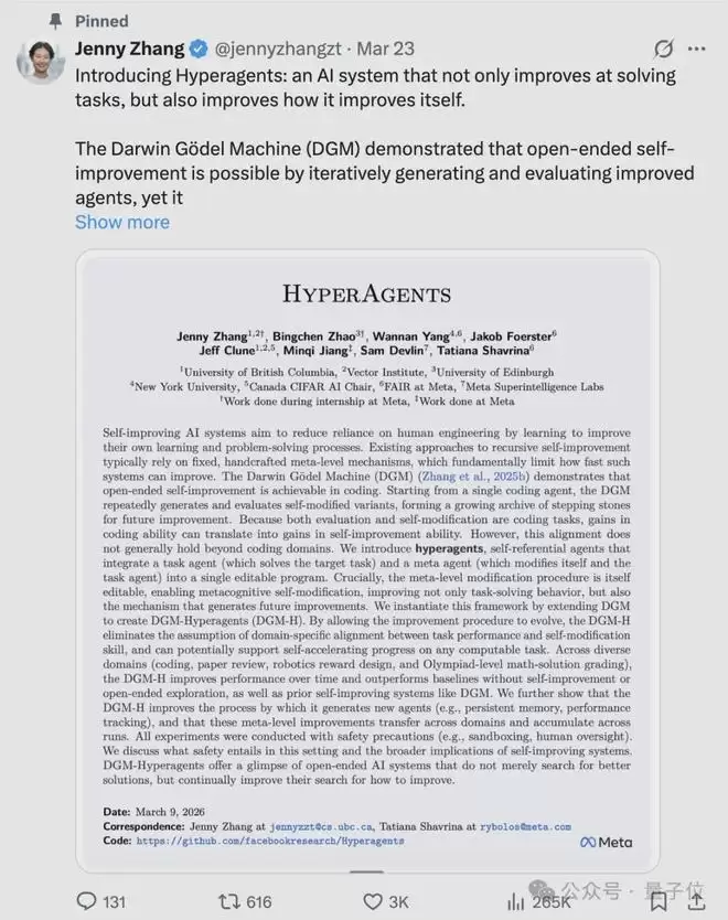 最近,Meta研究团队的一篇题为HYPERAGENTS(超级智能体)的论文迅速刷屏。