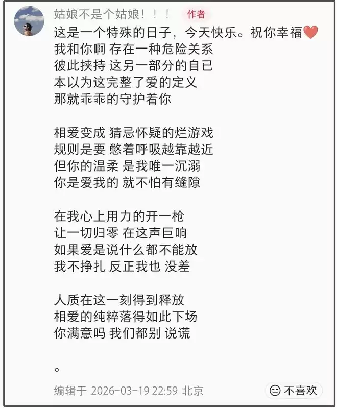 《再见爱人》播出后,两口子的合体热度都攀升不少,宋宁峰演员事业也有起色,所以张婉婷攻击第三者想要对方闭嘴的原因很清晰,只能说恋爱脑叠加利益无敌了。看张婉婷得知宋宁峰出轨后更新的动态,属于是依然蒙着眼要守护家庭。