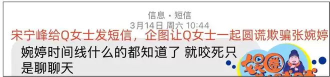 宋宁峰和张婉婷因为《再见爱人》被大家熟知,节目中歇斯底里的矛盾未能促使两人离婚,后来生了二胎继续维护婚姻。据娱记爆料,去年1月,宋宁峰和第三者Q女士在酒局认识,男方利用花言巧语博得女方欢心,于是女方在明知对方有家室的情况下交往了。今年3月14日,宋宁峰联系Q女士表示张婉婷知道俩人出轨时间线了,让对方咬死只是聊天试图隐瞒出轨。