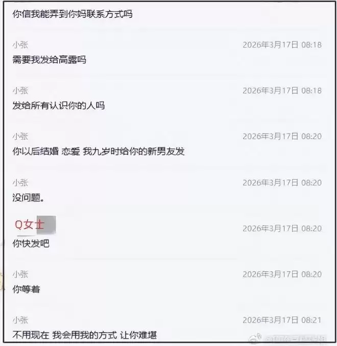 当Q女士反驳张婉婷让她看看自己宋宁峰发的,张婉婷淡淡地表示知道了,还强硬地要让Q女士在自己的朋友圈丢脸,把不雅照发给所有认识她的人,甚至还要发给Q女士未来的男友、老公,表示会用自己的方式让对方难堪。