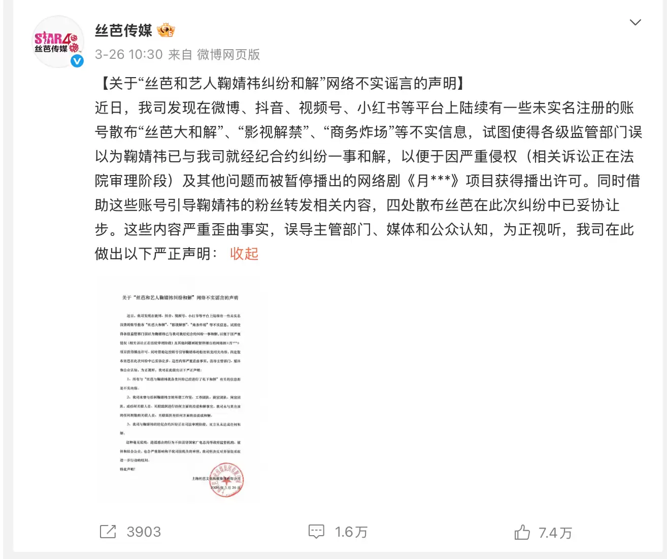 3月26日,丝芭传媒发布《关于“丝芭和艺人鞠婧祎纠纷和解”网络不实谣言的声明》,其中提到,丝芭未曾与任何鞠婧祎方的所谓工作室、工作团队、剧宣团队、网宣团队,或任何关联人员,关联组织进行任何方面的治谈和解事宜。