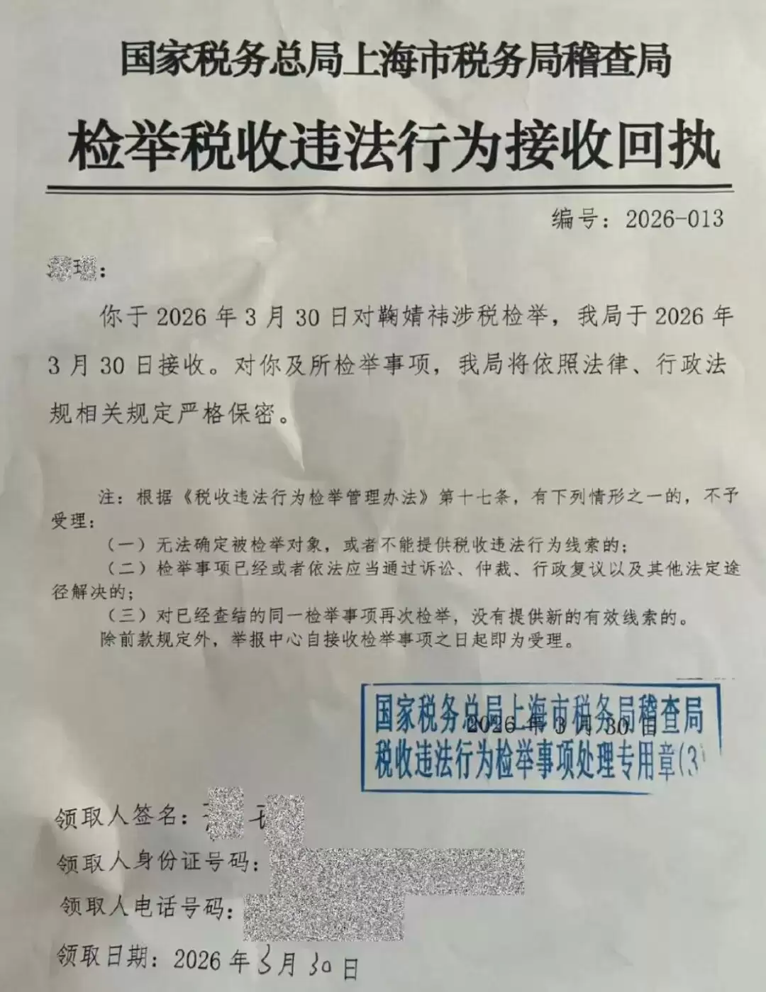 而国家税务总局上海市税务局稽查局则开出了“接收回执”。
