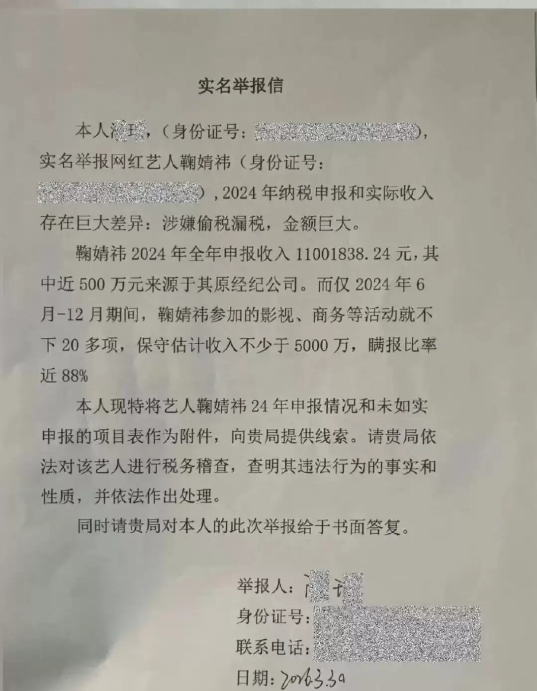 3月31日消息,3月31日,一张丝芭传媒实名举报鞠婧祎的举报信登上热搜,该举报信日期为2026年3月30日,信上描述鞠婧祎2024年申报1100万元,2024年6月至12月实际收入超5000万元,瞒报比例超过百分之88%。