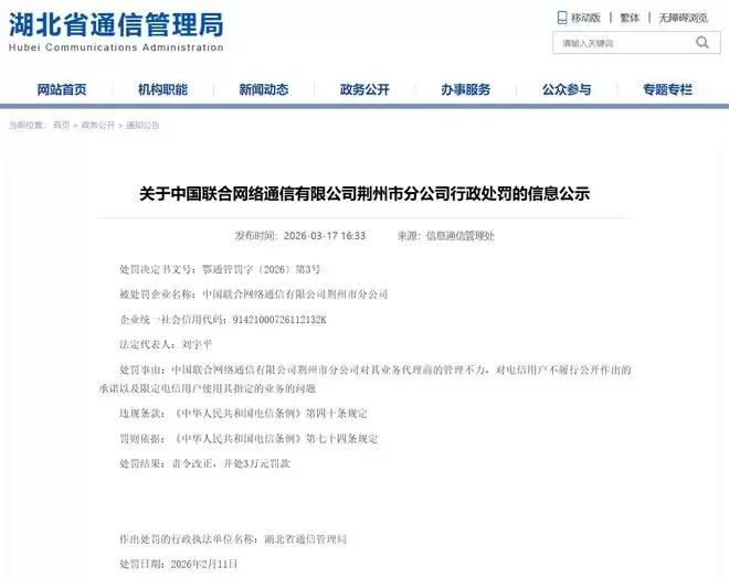IT之家 3 月 31 日消息,湖北省通信管理局 3 月 17 日发布公告,对中国电信股份有限公司孝感分公司作出行政处罚。