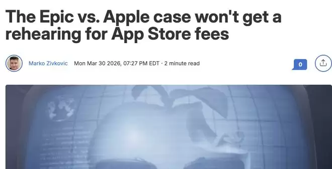 【环球网科技综合报道】3月31日消息,科技媒体Appleinsider报道,苹果与应用开发商Epic Games围绕应用商店费用展开的旷日持久的法律战,近日再次迎来关键进展。美国第九巡回上诉法院法官小组一致投票,驳回了苹果提出的重新听证请求,苹果试图推翻2025年12月法院裁决的法律策略宣告失败。