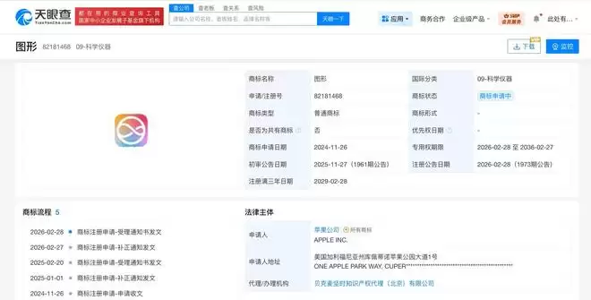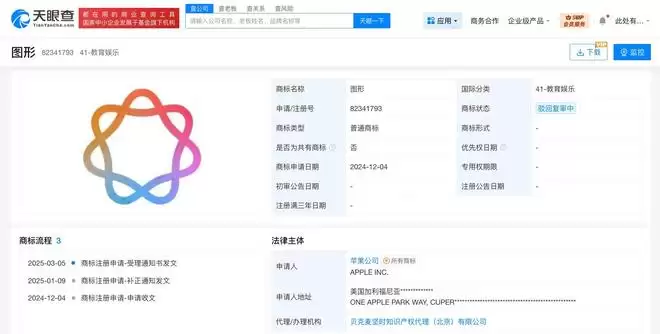 据天眼查知识产权信息显示,2024年,苹果公司已在中国申请注册多枚苹果智能相关图形商标,国际分类涉及 服务、教育娱乐、科学仪器等,当前多枚商标已被驳回复审,部分商标状态为初审公告。