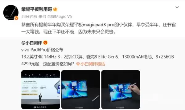 【CNMO科技消息】3月31日,荣耀平板与IOT产品领域总经理“荣耀平板利用哥”发文称,恭喜所有提前半年购买荣耀平板MagicPad 3 Pro的小伙伴,早享受半年,还节省一大笔钱。现在下单还不晚,因为未来只会更贵。