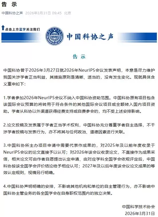 3月27日,中国科学技术协会发布声明表示,自当日起,停止受理学者参加2026年NeurIPS会议资助申请;收录于本届NeurIPS会议的论文,作为代表作成果申请中国科协所有项目均不予认可,同时,中国学者有关论文经相应全国学会依据学术规范评价后公正赋予的学术影响力,该会均予承认。