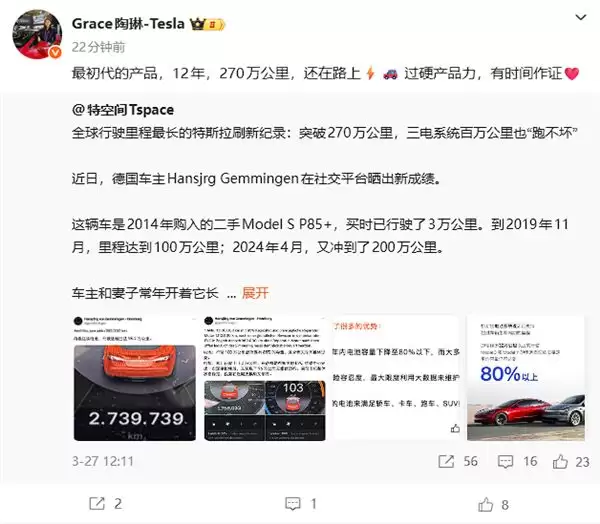 特斯拉行驶超270万公里创纪录,陶琳诠释硬核产品持久力