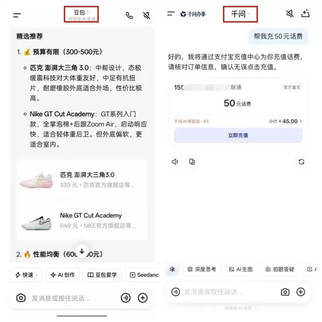 无独有偶,阿里旗下的千问则把触角伸向了支付领域。支付宝最新上线的“AI付”功能,直接嵌入了千问APP界面。用户不仅可以对着千问说一句“帮我充50块钱话费”,还能用这套流程在千问里购买瑞幸咖啡、点外卖、囤零食、买电影票,甚至订机酒和打车。