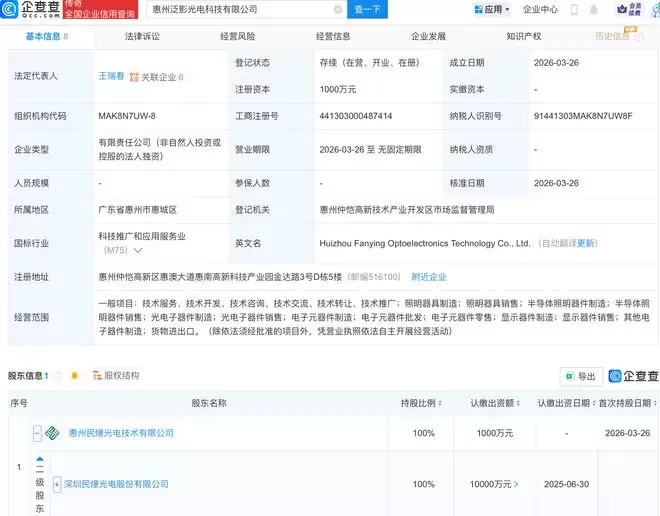 企查查APP显示,近日,惠州泛影光电科技有限公司成立,注册资本1000万元,经营范围包含:半导体照明器件制造;半导体照明器件销售;光电子器件制造;光电子器件销售等。企查查股权穿透显示,该公司由民爆光电(301362.SZ)间接全资持股。