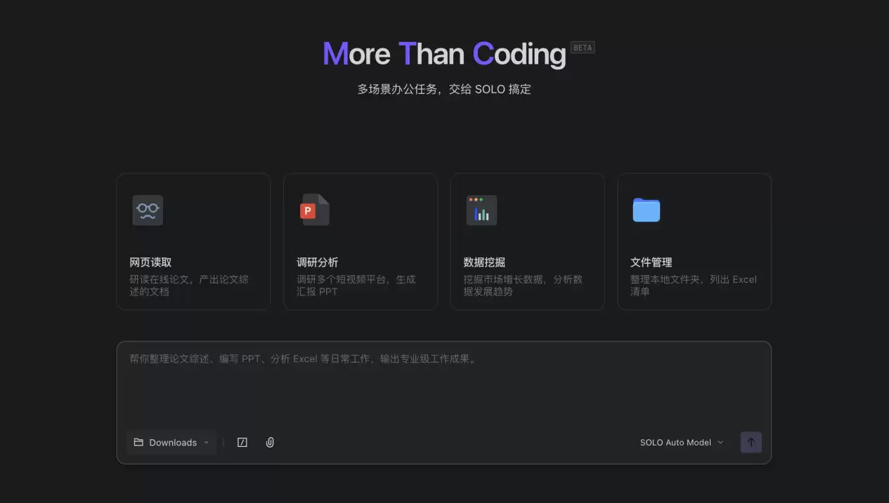 TRAE 原有的 SOLO 模式(SOLO Agent)深度集成于传统 IDE 架构,此次 SOLO 独立端的推出,旨在优化新用户的上手体验,降低 IDE 环境带来的学习曲线和使用门槛,将 SOLO 模式从编程领域扩展到更广泛的生产力场景。