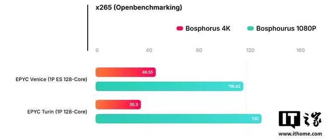 另一个单路 Kenya 平台则搭载 128 核 256 线程样片,配备两根 128GB 高速内存,主要运行了 x265 视频编码测试。