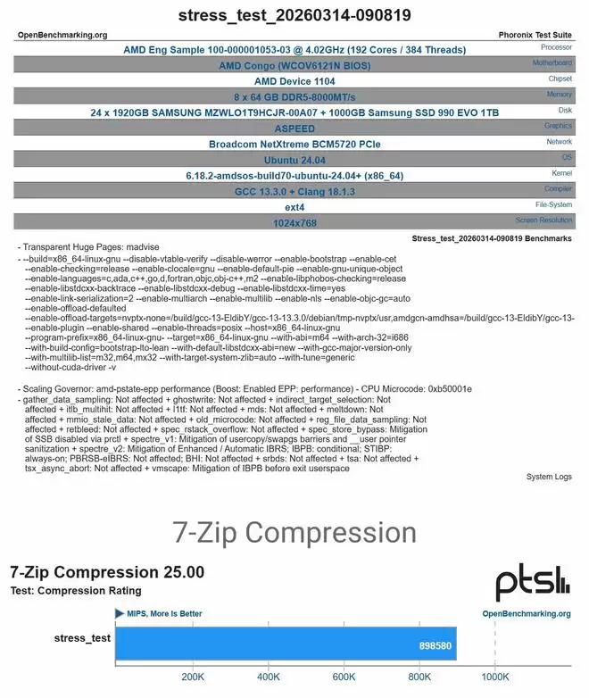 单路 Congo 平台搭载一颗 192 核 384 线程样片,主频达到 4.02GHz,搭配八根 64GB DDR5-8000 内存。该平台还测试了另一颗 64 核芯片,两款芯片均完成 7-Zip 压缩测试。
