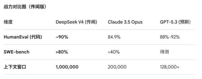 根据网传信息,下面是V4和Claude 3.5 Opus以及GPT-5.3的性能对比图。