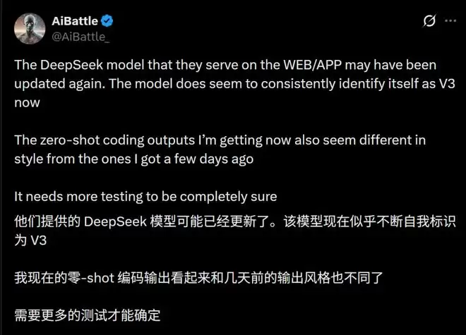 很有可能,V4的部分能力(或者是经过V4蒸馏后的版本)已经替换现有的V3接口,但标签还没改过来。用AI圈的术语来讲,这叫做「隐形进化」。