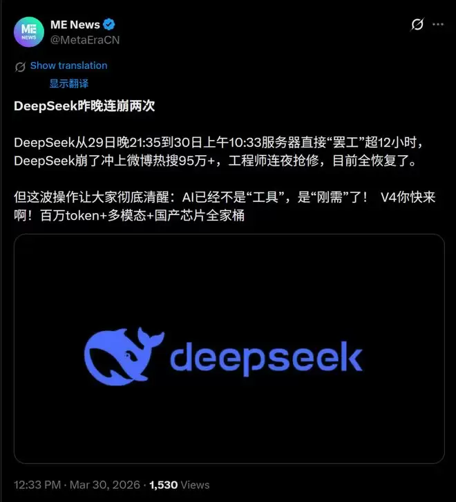 从3月29日晚21:35开始,一直到30日上午10:33,整整12小时58分钟。国产大模型之光DeepSeek经历了其自2025年初爆红以来,史上最长的一次服务器大罢工。