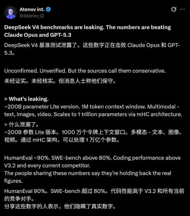 近期,圈内开始流传一组「DeepSeek V4基准数据」,虽然未经最新确认,但信息量极大——