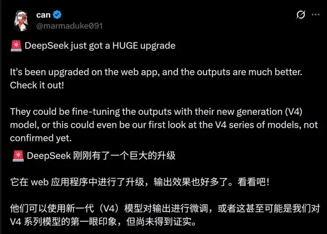 在社交媒体上,一大批开发者已经激动地晒出证据——DeepSeek V4,它可能真的来了。