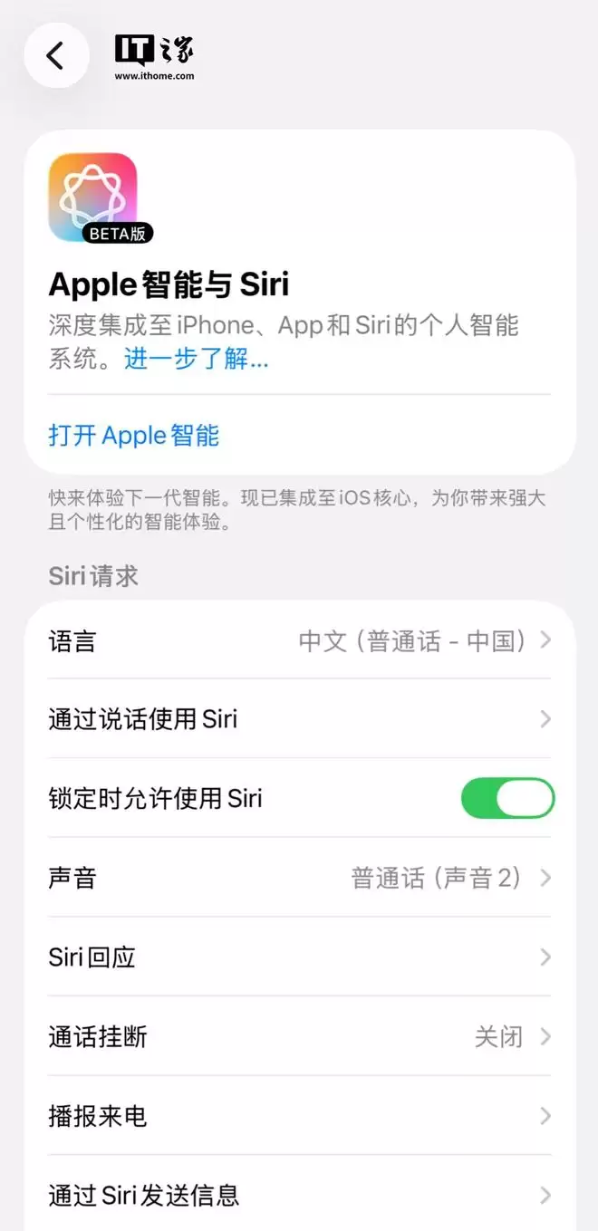 IT之家 3 月 31 日消息,今天凌晨,苹果突然在国行 iPhone 手机上线 Apple 智能(Apple Intelligence),当时只需要更新到 iOS 26.4 及以上系统,就能在设置页面看到原有的“Siri”设置将被替换成“Apple 智能与 Siri”,并可以下载 Apple 智能模型(大小约 9.5GB 左右)。