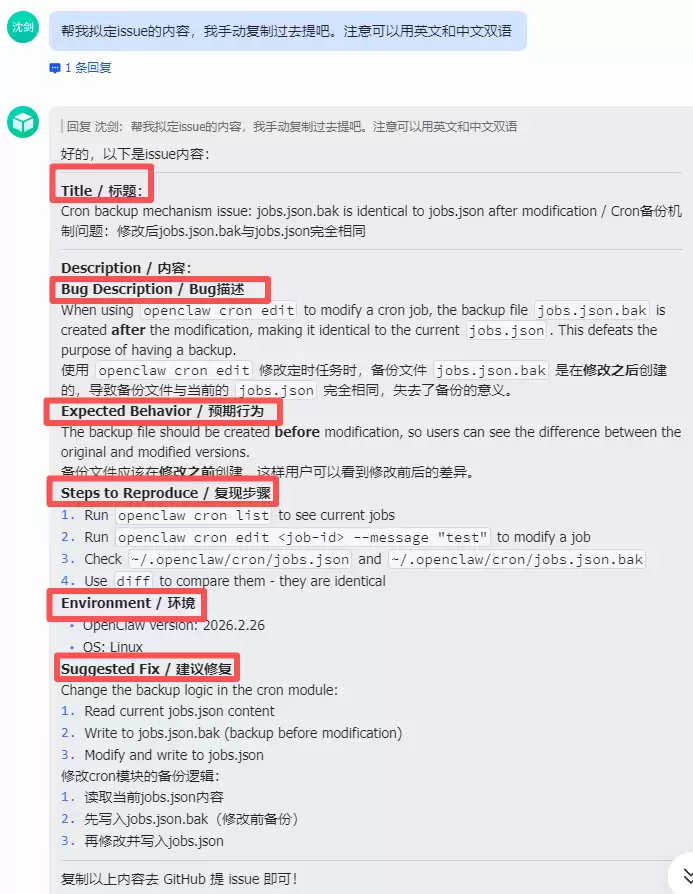 很快,OpenClaw就“哐哐哐”地生成了一份极其专业的issue描述,涵盖了逾期行为、详细复现步骤、环境信息,甚至包含了修复建议,堪称模板级输出。