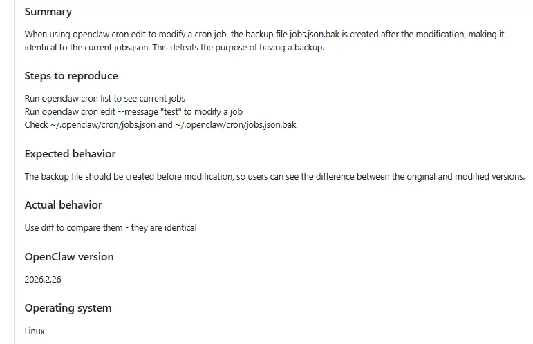 说来也巧,就在昨天实际使用OpenClaw时,意外发现了一个小Bug。于是,我按照流程给官方提交了一个issue。结果如何?过程远比想象中更有意思,且听详细分解。