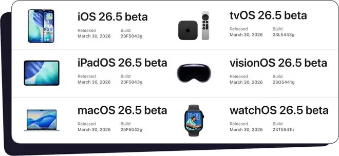 今天(3 月 31 日)凌晨,iOS 26.5 的首个开发者测试版正式发布,同时其他平台的 26.5 Beta 版本也同步上线,内部版本号如下: