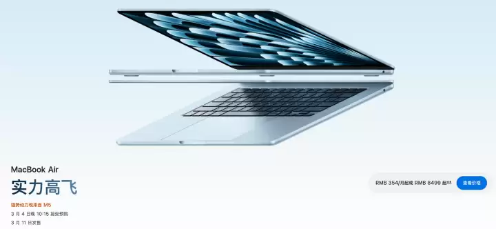 就在昨晚,苹果正式带来了搭载M5芯片的全新一代MacBook Air。这次更新提供了13英寸和15英寸两种尺寸选择,在核心性能、存储配置和无线连接等多个维度进行了显著升级。新品起售价定为8499元,将于3月4日晚上22:15开启预售,并计划在3月11日正式向消费者发货。