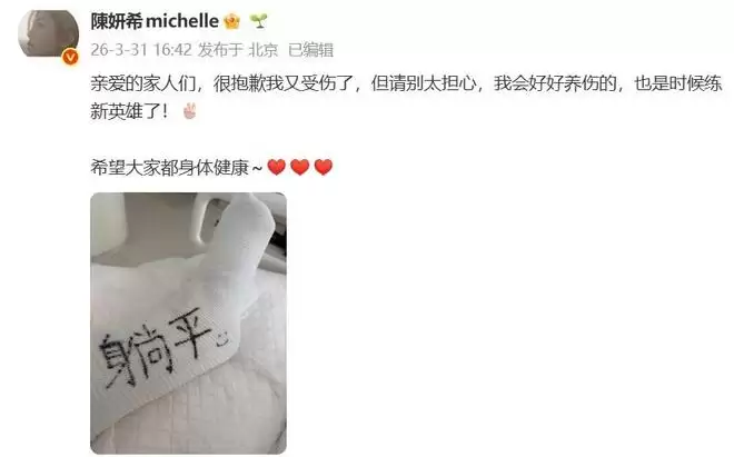 随后,陈妍希在社媒上发文报平安:亲爱的家人们,很抱歉我又受伤了,但请别太担心,我会好好养伤的,也是时候练新英雄了!希望大家都身体健康。