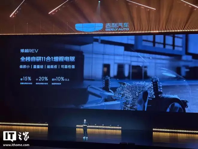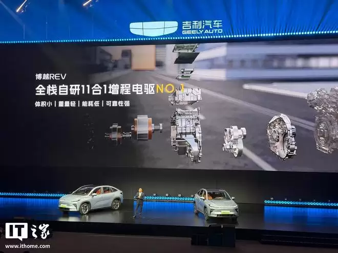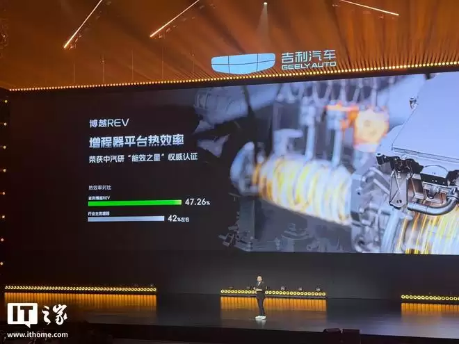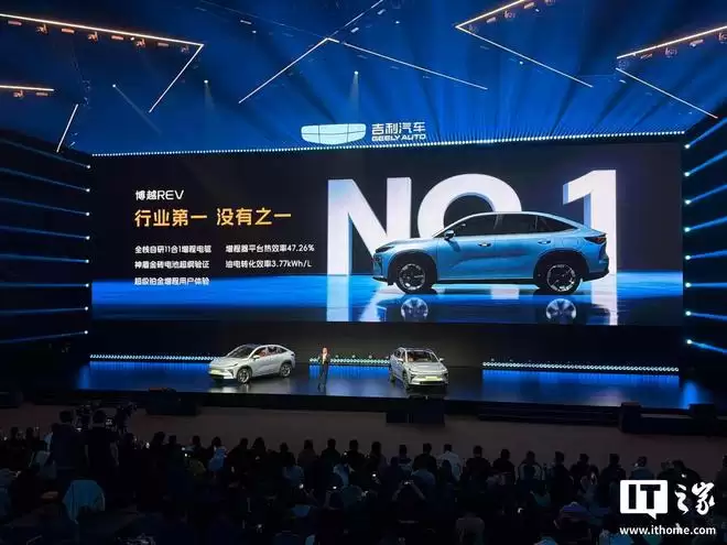 据介绍,吉利博越 REV 搭载全栈自研 11 合 1 增程电驱,增程器采用阿特金森循环、EGR 废气再循环技术及“御风火龙卷”高效燃烧系统,热效率达到 47.26%,可实现 1 升油发电 3.77 度的能效水平,馈电状态下油耗为 4.95 升 / 百公里。