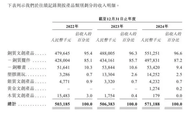 目前铜师傅共有四大类产品,分别为铜质文创产品、塑料手办潮玩,以及金银材质的文创产品。其中,铜质产品是公司营收的主要来源。2024年、2024年、2024年及2025年前9个月,铜质文创产品收入分别为4.8亿元、4.88亿元、5.51亿元及4.25亿元,分别占同期总收入的95.4%、96.3%、96.6%及94.8%,其中铜质摆件收入占比超过85%,产品结构十分集中。