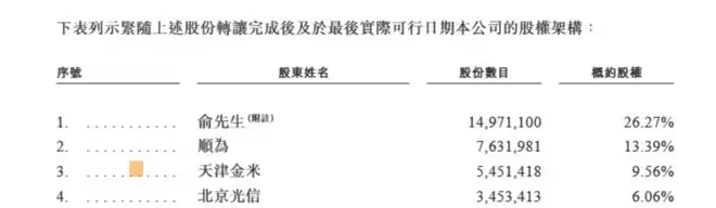 股权架构显示,铜师傅的创始人俞光直接持有公司26.27%股权,为第一大股东,顺为和小米旗下天津金米分别以13.39%和6.06%持股,位列第二和第三大股东。