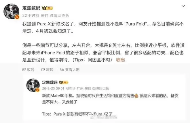 爆料中没有提到具体的产品系列信息,但相关推测认为其指的是华为旗下产品,具体型号应该是 Pura 90 系列和Pura X2。