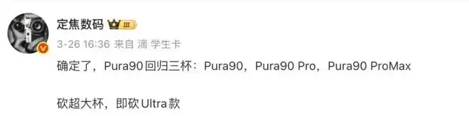 博主@定焦数码 近日的一份消息中也提到过,“确定了,Pura90回归三杯:Pura90,Pura90 Pro,Pura90 ProMax。砍超大杯,即砍Ultra款”。