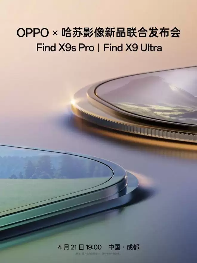 今天,OPPO正式宣布,OPPO × 哈苏影像新品联合发布会定档4月21日 19:00。届时将推出 Find X9s Pro、Find X9 Ultra 手机等新品。