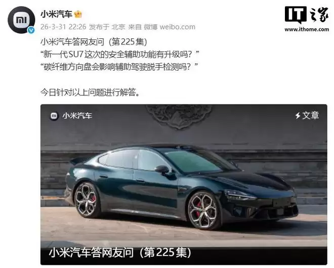 IT之家 3 月 31 日消息,小米汽车最新今日发布答网友问(第 225 集),针对新一代 SU7 这次的安全辅助功能是否有升级、碳纤维方向盘是否会影响辅助驾驶脱手检测等问题进行了解答。