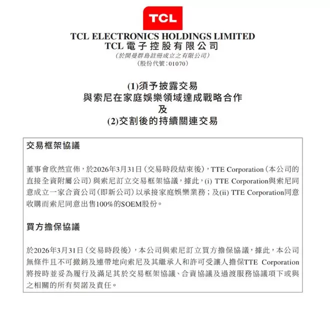 3月31日电,TCL电子公告称,其全资子公司TTE Corporation已与索尼达成交易框架协议,双方将围绕索尼家庭娱乐业务展开战略合作。